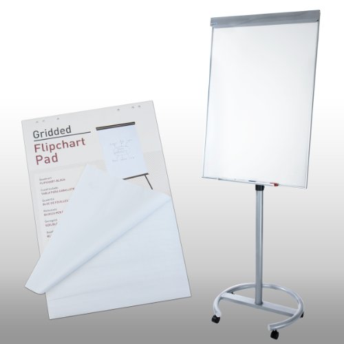 Top of the range mobile Flipchart suitable for frequent office use. The flipchart is fitted with a premium quality, highly stable round base (open at the front) with 5 swivel castor wheels, usually only seen on more expensive models. It is height-adjustable up to approx. 210 cm and comes complete with 2 foldable side arms. Mobile Flipchart with designer base, consisting of 5 swivel castor wheels, 3 with wheel stops 104 x 73 cm (writing surface), height-adjustable up to approx. 210 cm includes 2 folding side arms which significantly enlarge the writing surface Melamine rear panel, can be written on with dry wipe board markers specially-coated easy-wipe surface enables high-contrast writing magnetic, with integral storage shelf adjustable paper holder, suitable for most current flipchart paper blocks comes pre-assembled, for quick and easy constructionincludes magnets and magnetic board eraser Flipcharts remain one of the most popular and commonly-used mediums of presentation - ideal for meetings, presentations and moderating. Handwritten annotations, bullet points and diagrams assist in making your presentations more lively and animated. The drop-down list at the top of the page enables you to purchase the flipchart either without paper, or with 100 sheets of either plain or squared paper included (5 paper pads, each with 20 sheets).